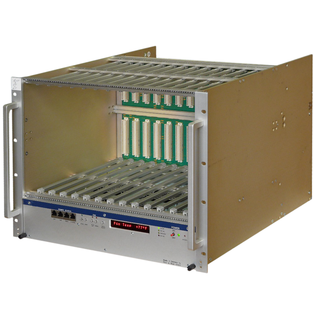 The VXI‑C size 6021 Crate combines a rugged steel–aluminum 8U enclosure with a 13-slot VXI backplane, microprocessor-controlled fan tray, and modular high-density power supplies. It delivers up to 6 kW of DC power via “Cavity‑VHF” switching modules with comprehensive protection and programmability. High-performance cooling is provided by a bottom fan tray housing six individually controlled DC fans (1,200–3,600 RPM) with thermal and speed monitoring. Built-in diagnostics, LED display, and remote control interfaces (Ethernet) enable full system monitoring and integration into automated setups. With optional temperature sensors and a flexible, modular layout, this crate is engineered for reliability in high-demand environments.