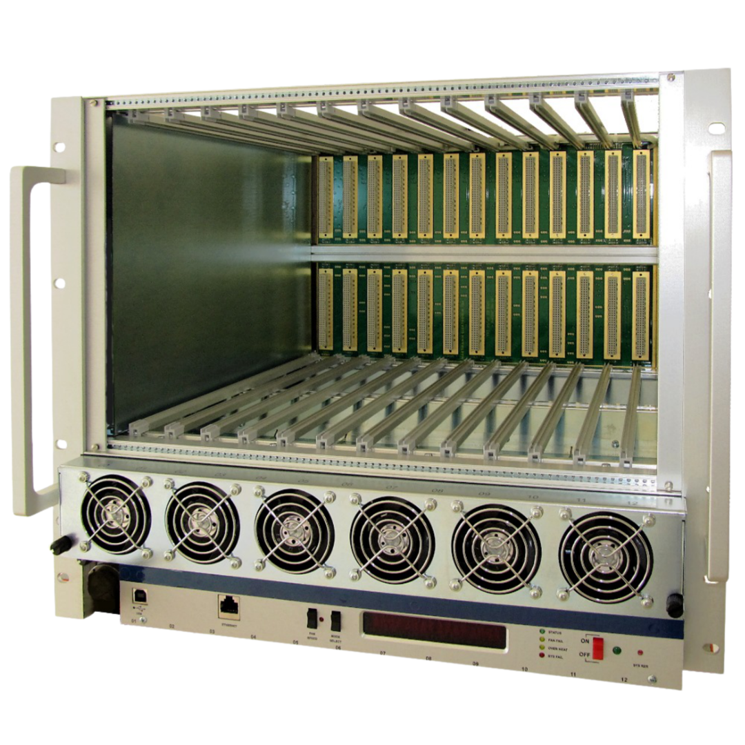 | Mechanics & Slots | 19″ enclosure for 13 VXI modules (C-size, 6U × 340 mm) Rugged steel–aluminum construction with 5 mm side plates and precise rail alignment Monolithic 13-slot multilayer VXI backplane with active termination and automatic daisy-chain (VXI-4 optional) Front-removable fan tray and front-loading modular power supply Two height versions: 8.5 U (medium power, up to 2 kW) or 10 U (high power, up to 4 kW) Optional support for up to 8 temperature sensors above the module cage |